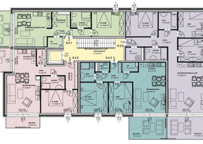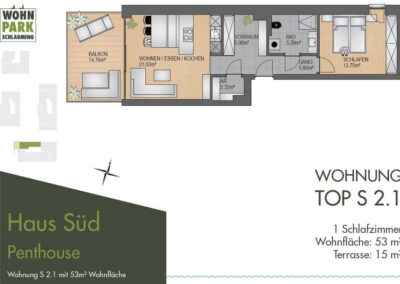 Byt S 2.1 – Penthouse (2. patro, Haus Süd) nabízí obytnou plochu přibližně 53 m² a balkon o velikosti 15 m² orientovaný na západ. K bytu náleží také sklepní prostor cca 5 m².