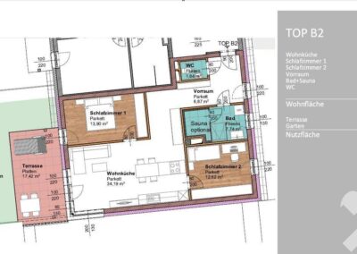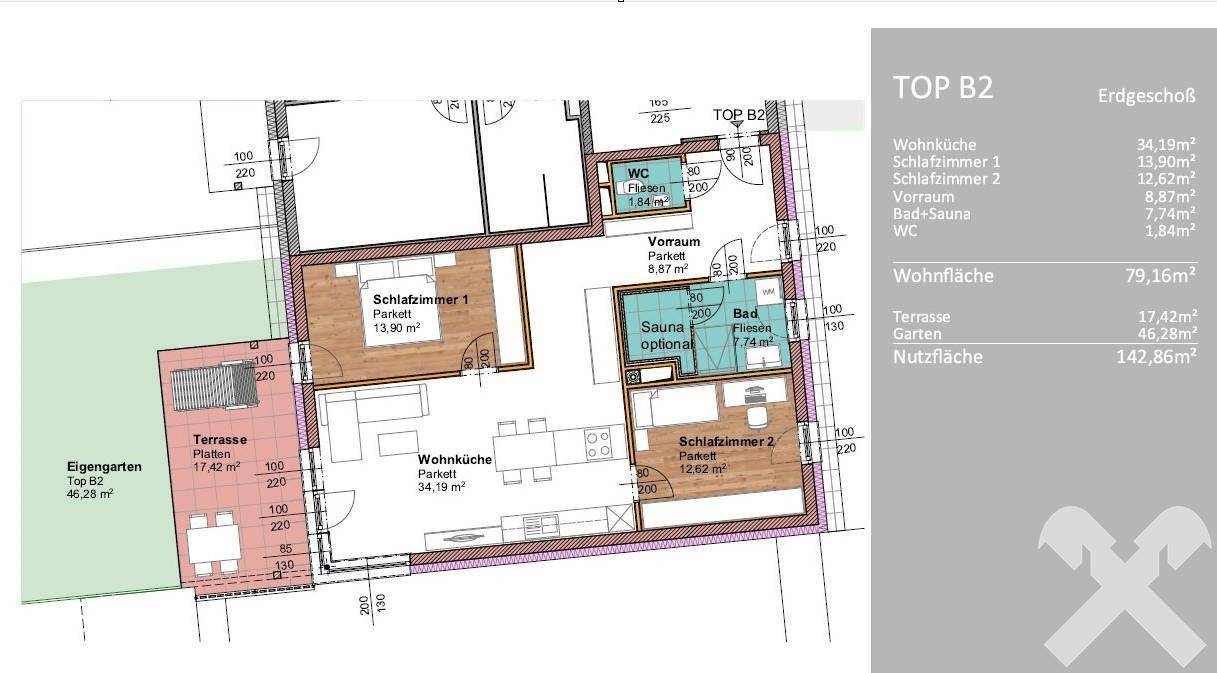 - Soukromá terasa (17 m²) s přilehlou zahradou (46 m²)